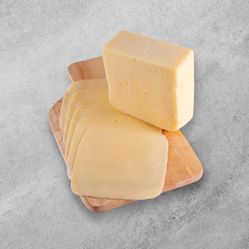 El queso Havarti en barra, hecho de leche de vaca, es semiblanda, con textura cremosa y agujeros pequeños. Su sabor es suave y mantecoso, con un toque ligeramente ácido. Ideal para fundir o en sándwiches.
